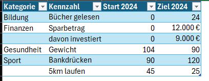 In unserem Beispiel haben wir 4 Kategorien, die 1-2 Ziele beinhalten. Diese werden in den Input Tabellen als Endwerte für 2024 hinterlegt.