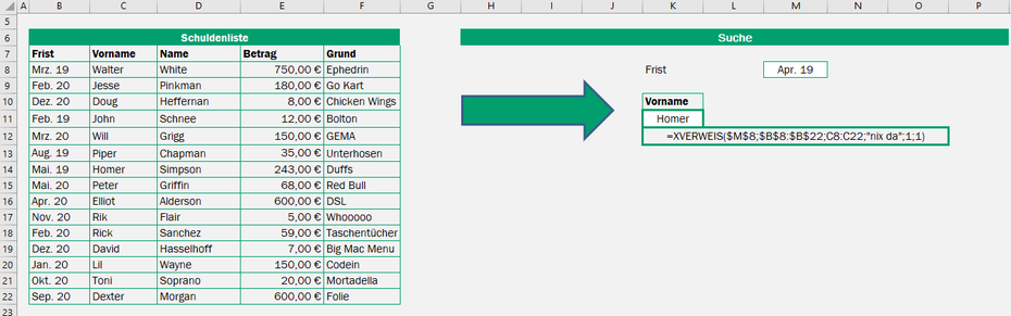 Bei der Suche nach der Frist (April 19) finden wir keinen exakten Treffer, also nehmen wir den nächst höheren Monat als Suchkriterium. In diesem Fall ist das der Mai 19 und dem dazu passenden Rückgabewert Homer.